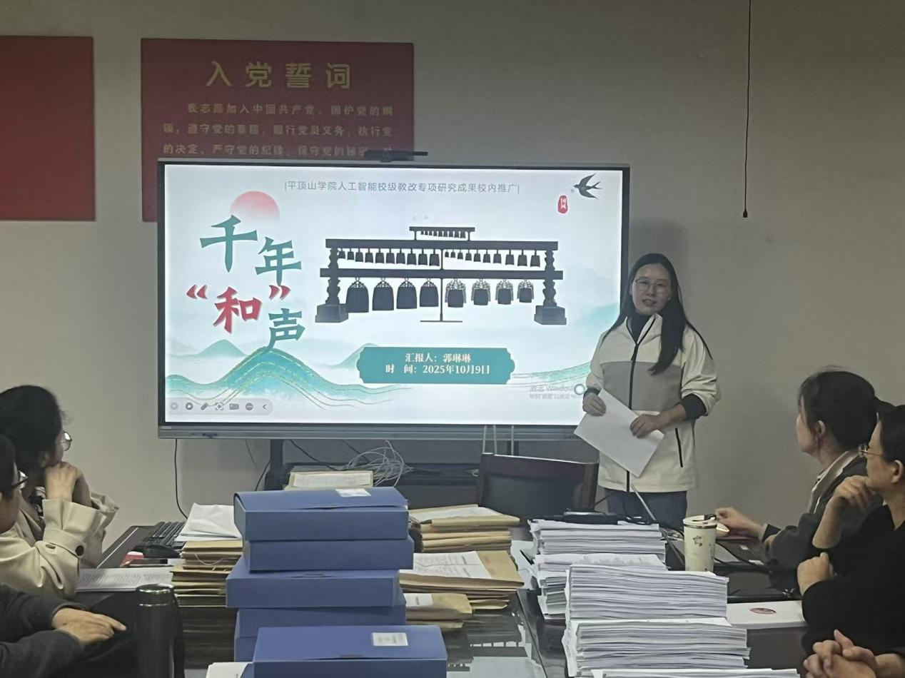 为加强人工智能校级教改专项研究成果在我校的推广与应用,促进优秀应用场景案例的交流传播和互学互鉴,10月9日下午,在艺术楼A218会议室,音乐学院郭琳琳老师为我院教师作了题为《数字编钟敲响千年“和”声》的成果推广宣讲。