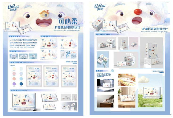 创意思想:以“柔绒为底,鼻形为魂”的同构巧思,把“护鼻”的温柔具象成触手可及的治愈:将包装的主视觉与鼻子形态做视觉同构——用贴贴怪IP形象的柔暖肌理,直接化作“鼻子”的温柔轮廓,让包装本身就是“被呵护的鼻头”;同时把“护鼻”的文字意象,藏进这团柔绒的褶皱里,实现“形与字”的意象同构:绒是鼻的软铠甲,字是鼻的轻安慰,鼻间症状随烟飘去,每一处细节都呼应“30次擦拭不红鼻”的安心承诺。当“鼻形、柔绒、护字”在包装上共生,看到的是“被裹住的鼻头”,摸到的是“轻软的呵护”,读懂的是“不泛红的安心”——把“温柔、有爱、呵护、安心”的品牌调,揉进同构的每一处细节里,让拿起包装的瞬间,就像鼻头被轻轻裹进暖软的呵护里。